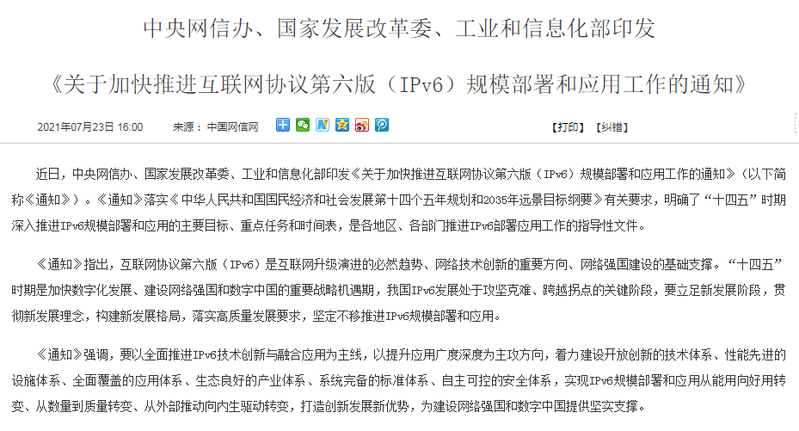 近日,中央網信辦、國家發展改革委、工業和信息化部印發《關于加快推進互聯網協議第六版(IPv6)規模部署和應用工作的通知》(以下簡稱《通知》)?!锻ㄖ仿鋵崱吨腥A人民共和國國民經濟和社會發展第十四個五年規劃和2035年遠景目標綱要》有關要求,明確了“十四五”時期深入推進IPv6規模部署和應用的主要目標、重點任務和時間表,是各地區、各部門推進IPv6部署應用工作的指導性文件?!锻ㄖ分赋?,互聯網協議第...